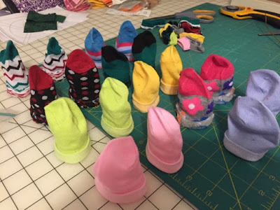 The hats were so fun. I got baby socks at the $ Store. Then cut off the heel and cuff and folded over what was left to make a cuff for the hats. After a bit of deliberation I machine sewed the cuff down to avoid fraying and disappointment in the future. Then College E hot glued pompoms to each one. They are so cute.